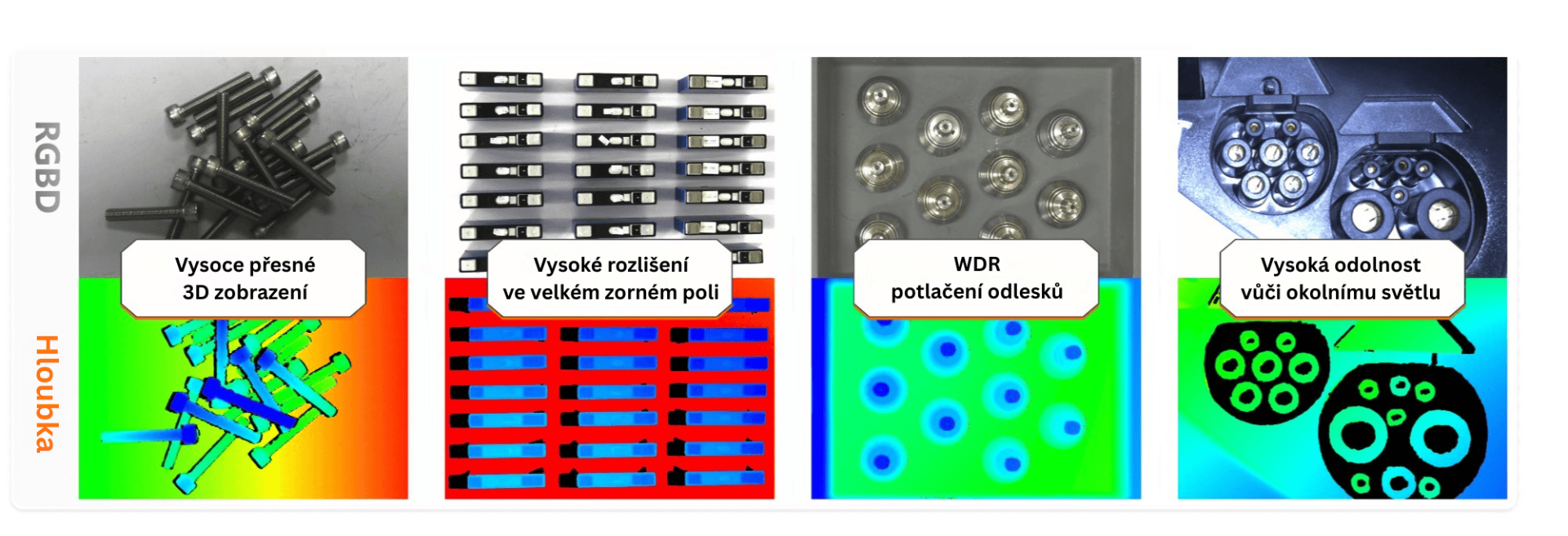 Dokáže se přizpůsobit náročným podmínkám, jako jsou povrchy pohlcující světlo, vysoká odrazivost nebo rušení okolním světlem. Zajišťuje tak vysoce přesné a stabilní 3D zobrazení, které nachází široké uplatnění například při robotickém uchopování dílů (bin picking) nebo měření při montáži.